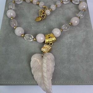 Pink quartz necklace with carved pink quartz leaf pendant 12 1/2 “ drop (approx)