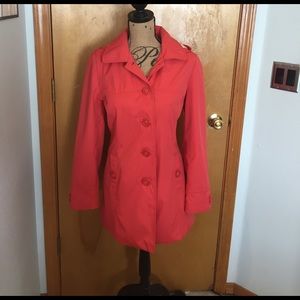 Pink rain coat in excellent condition. Still has a spare button attached. Size medium, essential addition for your spring time closet. (brand is listed for exposure)