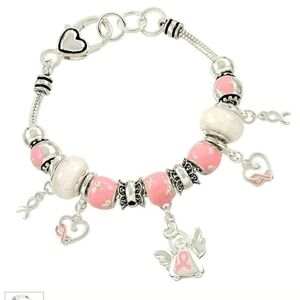 Pink Ribbon Theme Bracelet / Enamel / Murano Beads / Metal Beads / Silver Plated / Lead Compliant