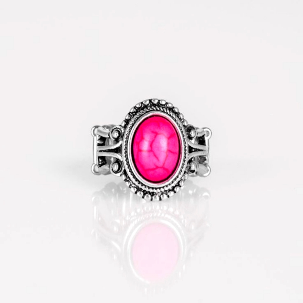 A sweet pink stone Pressed into the center of a silver band. A stretchy band for a flexible fit. Lead and nickel free