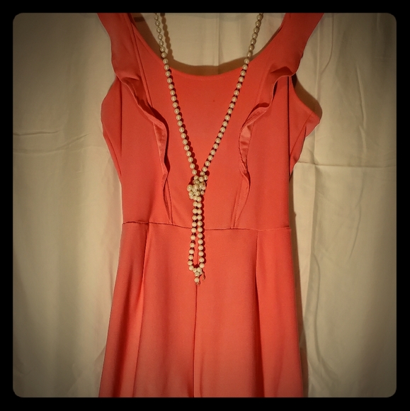 This sweet coral pink shorts romper has ruffle embelishments across the bust and ties in the back for a perfect fit.