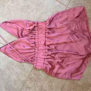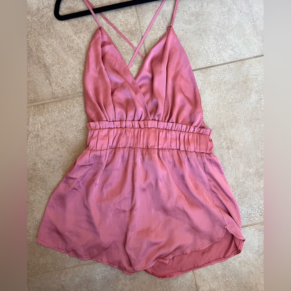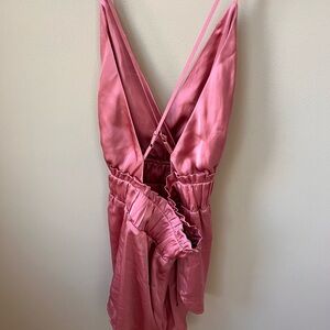 Chic pink sleeveless criss cross backless romper with a gathered waist. Perfect for Bach parties or a night out.