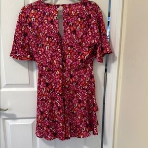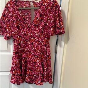 Elegant dress with a chic pink and red pattern. Features a stylish cut and short sleeves. Shorts underneath