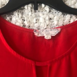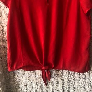 Red blouse. Brand: pink rose. Slight flutter sleeve, tie at waist. Very flattering on!