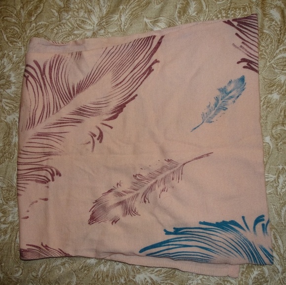Lighter weight but very warm pink scard with blue and brown feathers.