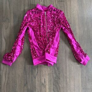 Pink zip up long sleeve jacket. Satin side and inner arms to prevent catching. No pulls or missing sequins. Great for tap or hip hop routine. Fits size child medium or 7/8.