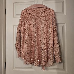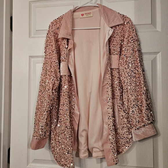 southern fried chic, light pink sequin shacket. size small, runs big. EUC