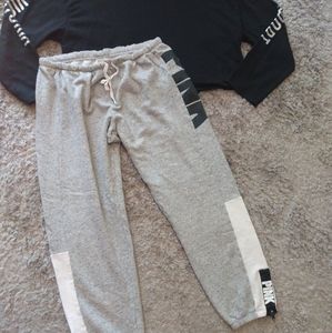 vs pink set size large black cropped sweatshirt with silver print on sleeves and gray sweatpamts