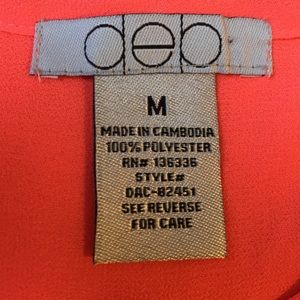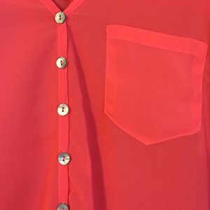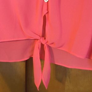 This is a pink sheer shirt with a tie at the bottom and a pocket on the upper right side of the shirt from Deb.