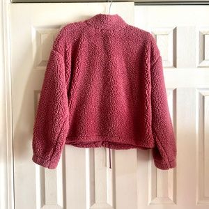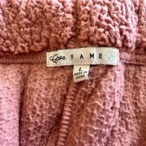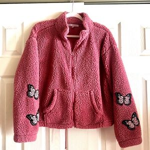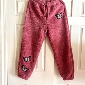 Crave Fame pink sherpa set. Jacket is zippered with embroidered butterflies on both sleeves. Pants are gathered at bottom, embroidered butterflies on hip and bottom of one leg. Jacket is XL, pants are L. 100% polyester, machine wash.