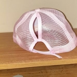 Women's pink sparkly high ponytail hat has two holes one for a lower ponytail and one for a higher ponytail