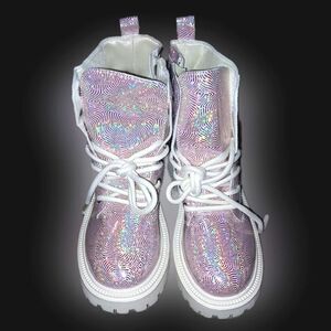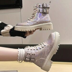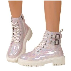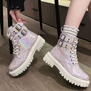 Women's Fashion Iridescent Pink Ankle Booties with Side Zipper, Round Toe Platform Heel, Rubber Sole, Canvas Insole & Lining, Mid-Heel Sparkle Short Boots with Decorative Buckle Detail