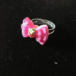 Handmade Crystal Iris Design Ring. Pink Bow with Strawberry. Adjustable. Bundling available.