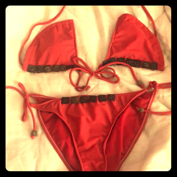 Pink string bikini with wooden brown squares. Top and bottom are both adjustable with ties. Slightly padded too.
