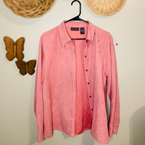 Cute pink suade button down with embroidery around the buttons