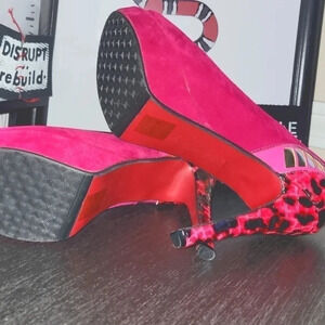 Fuchsia pink faux suede peep toe pump with reinforced ball rubber and red bottom. NWOT size 8.5
