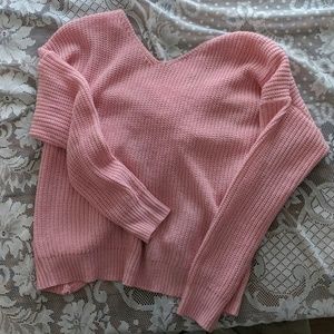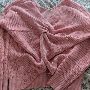 Beautiful pink low back sweater. Pearl accents on the back. Said one size fits all when I bought it. I'm a size s/4 and it fits with plenty of room. Could easily fit up to a m/L. Only been worn to take this picture.
