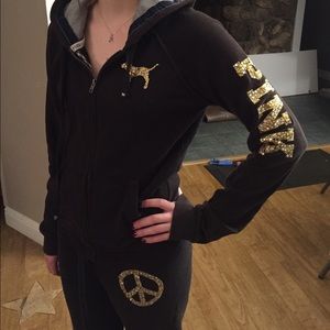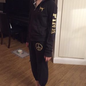 Jacket is a size medium. Sweats are a size xsmall. Both in a good condition. A little faded from being washed but that's all.