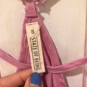 Neat design on this top. Spaghetti strap top with a string across the chest for a fun different type of top. The material of this is great and a little thicker and not sheer at all. Beautiful color!