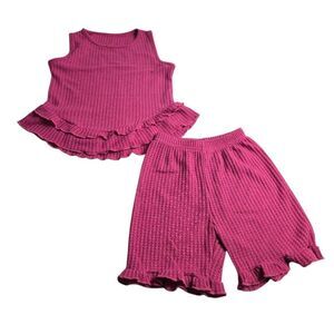 Pink tanktop shorts Matching outfit 130 6/7. Top, 14" pit to pit, 16" total length from shoulder to hemline. Bottom, 8.5" waist, 14" total length, 5" inseam. EUC. 6oz