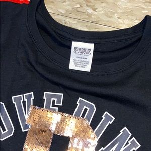 This is a tee from PINK. NWOT. Has sequence, black and red, and gold.