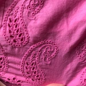 Pretty pink two petite and loft petite top with Ty to the front. Chunky straps and a zip on the side. It has a very cute handkerchief like crochet pattern to the bottom. C minor flaw. Very light discoloration to under arm. Very minor and not noticeable