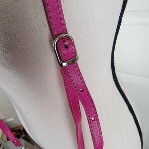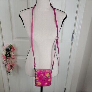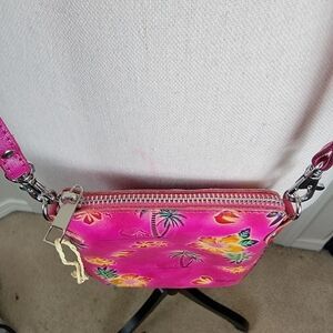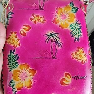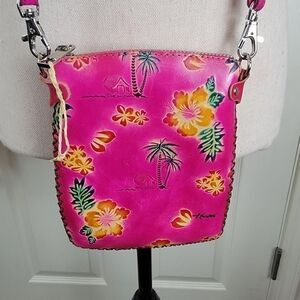 Unbranded, tooled leather crossbody bag. Thick stitching around the edges, and zipper closure. Long thin strap. Hibiscus flowers and palm trees on a pink background. One front pocket and main compartment.