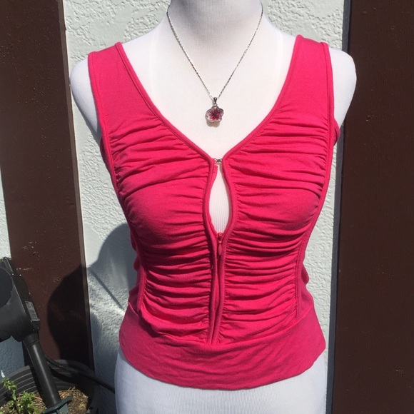 This top has a zip in front to adjust the opening, or close it completely. 92% rayon, 7% spandex, very stretchable. Color is darker pink. Size M which is close to size 4-6. No damages.