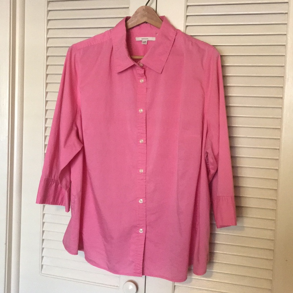 All pink 3/4 sleeve collared button up by Merona. Love the way it fits it is very flattering.