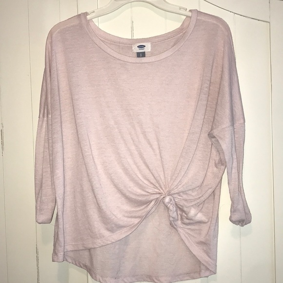 A light pink 3/4 sleeve shirt. It is see through but looks cute with a sports bra under. It is soft and comfy and can be untied if you want.