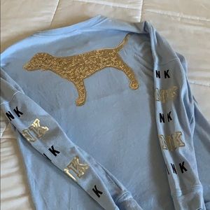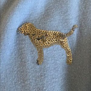 Baby blue PINK long sleeve. Says PINK on sleeves. Sequin on dog front and back. Little hole on shoulder area.