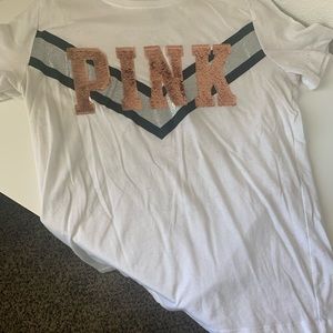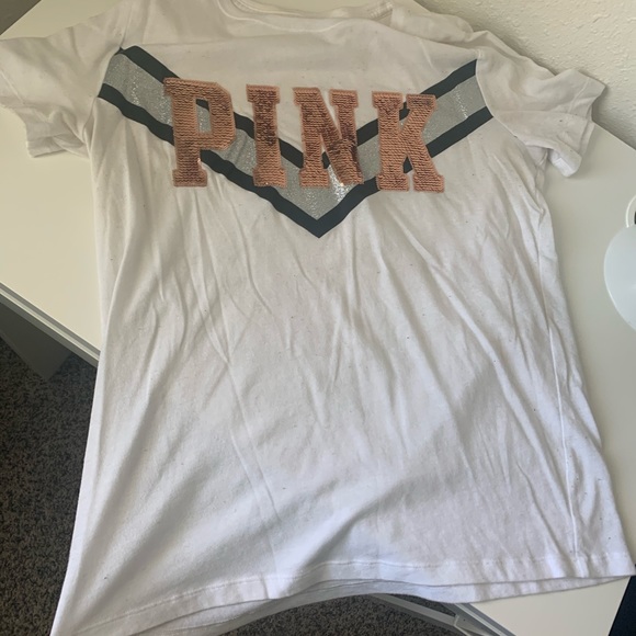 This is a cute PINK shirt for lounge wear and outings!!! This has been worn and may be linty and not as white.