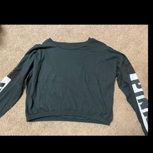Cropped, with mesh on the sleeves. Pink written down both sleeves