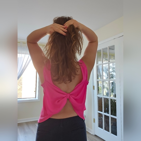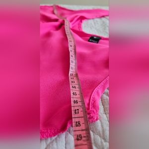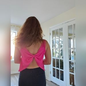 This pink seems to change shades in different lighting. Bow in the back of the top is eye catching! Super lightweight material. No size on tag but it measures 48 inches from one side to the other.