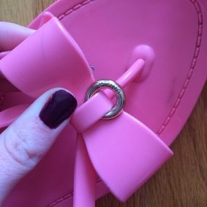 Rubber unisa flip flops. Super fun and girly with an adorable bow on the front. Shoes have been gently used, have two stray marks as pictured otherwise in good condition. I have to say these run a little small I am a size 7 and have a little bit of space by my heel