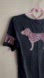 Chic black V-neck tee. Features pink logo detail. Perfect for casual wear.