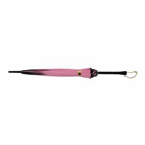 Simple and elegant, this beautiful parasol is waterproof and a fully functional rain umbrella. Too much sun? Protect yourself from UV rays in style. Inspired by the culture of New Orleans, this parasol is perfect for rain, shine or second line! Featuring beautiful trim at the umbrella ribs, 16 panel pagoda style design, manual open and close, metal shaft, metal frame, nickel tips, elegant wooden handle, and gold electroplated solid brass chain. Colors: Pink & Black Closed length: 34 in., open diameter 36 in.