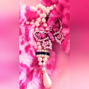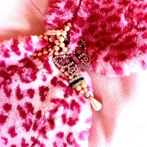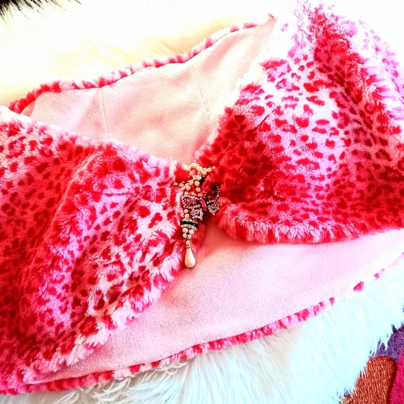 unique pink leopard faux fur .warm soft luxurious wrap to keep yr arms warm and chique. with jewelry butterfly and pearls 💖 for the barbie fashionesta😉 looks better in person 😘
