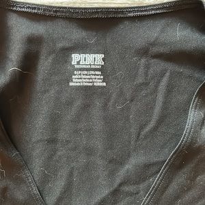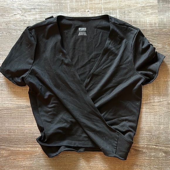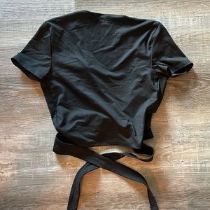 Pink wrap top, black, stretchy material, wraps around and ties in back, cropped