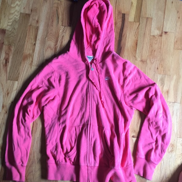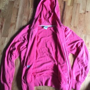 A pink zip-up jacket with a hood. There is no drawstrings, but there is a headphone slit in one of the pockets where you can put your headphones through.