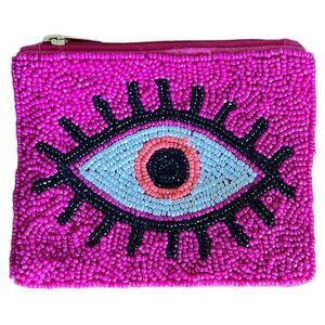 Vibrant pink beaded clutch featuring a striking eye design. Perfect for adding a pop of color to any outfit.