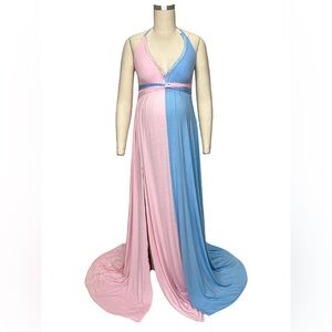 Cute color, V-neck, sleeveless, backless, floor length maternity maxi dress.The elastic waistband makes the dress come in at the waist slightly. Adding a belt really elevates the look of the dress. Having a belt also helps modify the fit of the breast area. So lovely dress for Maternity photo shoot or party.