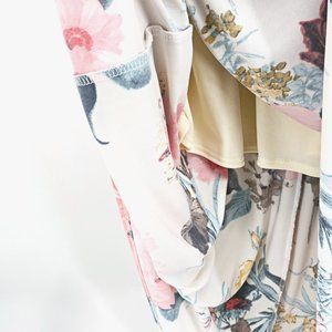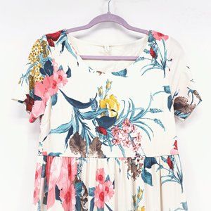 Cream short sleeve maxi dress with a round neckline and colorful floral pattern. 96% polyester 4% spandex for a stretchy, comfortable fit. Size medium. Style KD31395-01