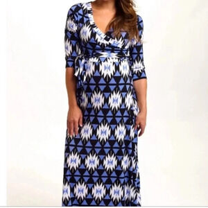 Pink Blush tribal Aztec print maxi maternity dress. 3/4 sleeves, wrap style, tie waist.