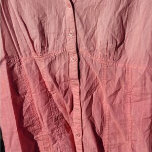 Two Toned pink collard button down top. The sleeve length is about 3/4 length or a little bit longer. The sleeve had a slit in the cuff. Can be worn dressy or casual. The color is more like the pink in the last 2 pics with the measurements.