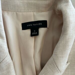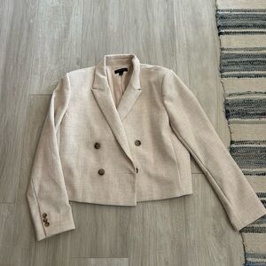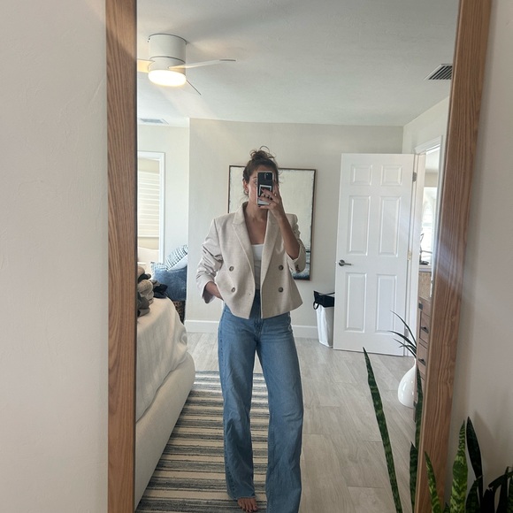 This pink/cream toned blazer is so chic and versatile. Can be dressed up or down. Size 12 but I’m typically a small and fits well!