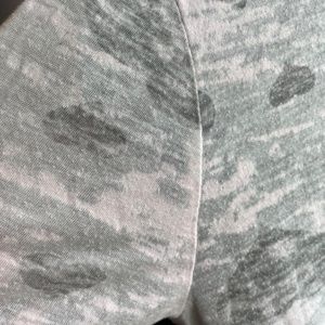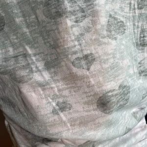 This gauzy amazing little shirt is a soft pink with gray/brown hearts. It's made "inside out" with the darker side of the fabric facing in. It's nearly, entirely see-through so own it OR be ready to layer it with another top.
