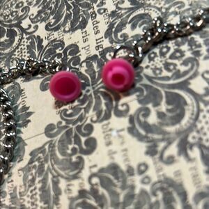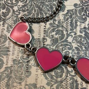 Charming pink heart necklace perfect for adding a touch of love to any outfit. Features vibrant pink heart charms on a sleek chain. G130 approximately 13”.