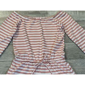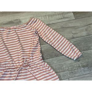It can be worn on the shoulders or off the shoulders, and it has pockets, with an elastic waist and tie drawstring