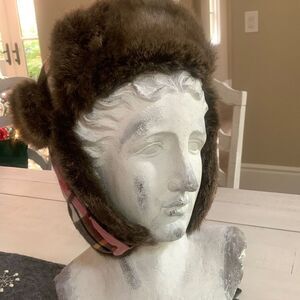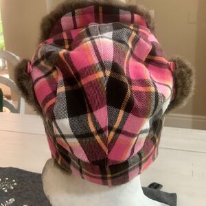 Cute pink and brown plaid hat. Has built in ear muffs that can be worn up or down. Faux fur bill.
